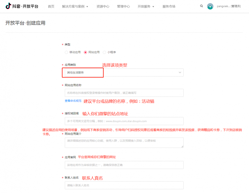 抖音爆店码螃蟹霸屏大师使用教程:申请抖音开放平台 作者:网络 • 更新时间: •阅读 1、首先注册抖音开放平台账号(https://open.douyin.com/) 2、完成开放平台账号的认证 3、创建一个网页应用 本文由网上采集发布,不代表我们立场,转载联系作者并注明出处:https://www.yncy.com.cn/a/zixun/peixun/2021/0527/129.html